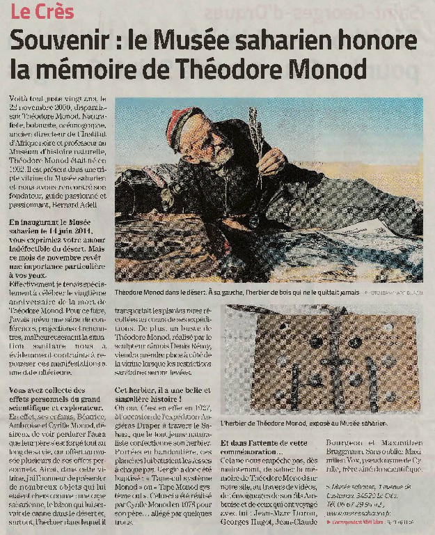 Ce mardi 22 novembre, pour le vingt-deuxième anniversaire de sa disparition, le Musée Saharien rend hommage à Théodore Monod en accueillont deux de ses compagnons de route: Jean-Marc Durou, photographe, et Jean-Claude Bourgeon, guide saharien. Au programme, présentation de la nouvelle vitrine « Théodore Monod » et de son buste réalisé par le sculpteur Denis Remy, conférence, projection, table ronde… Avec le soutien de la Mairie du Crès.