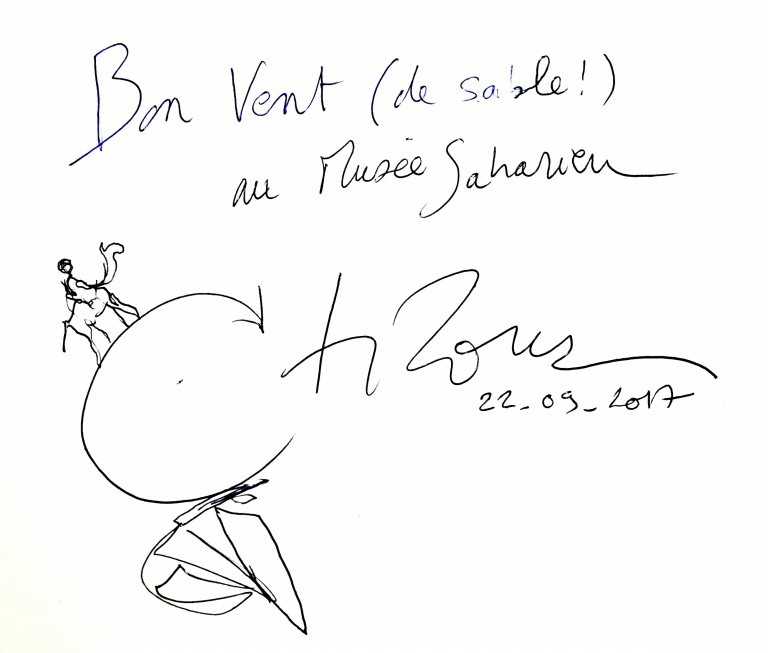 Belle surprise que la visite de Titouan Lamazou au Musée saharien, le 22 septembre. Grand navigateur, dessinateur inspiré, écrivain de talent, il souhaite pouvoir disposer de quelques objets sahariens destinés à enrichir une exposition de ses croquis africains, prévue pour 2019 à Marseille. Requête exaucée, bien sûr, par Bernard Adell, heureux et flatté de cette marque d’amitié et de confiance.