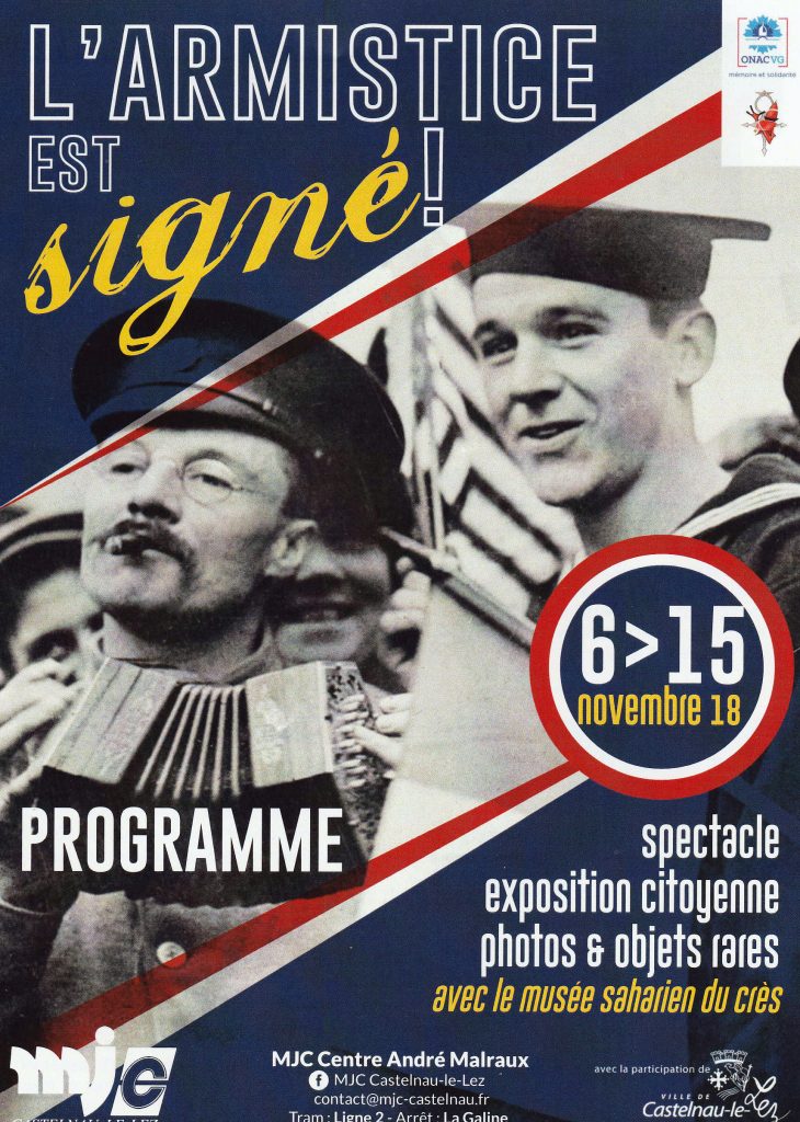 Derniers jours pour visiter, à la MJC de Castelnau-le-Lez, la très intéressante exposition « L’ARMISTICE est signé » comprenat en particulier des objets rares prêtés par le Musée Saharien (un uniforme de soldat de Lodève, des armes du front, un gisant de jeune soldat, des journaux d’époque). Ecoutez aussi les chansons de la Grande Guerre interprétées par Pasqualino Frigau et Julie Lisiak. Jusqu’à vendredi de 9h à 12h et de 14h à 19h.